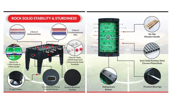 The KICK Legend 55" Foosball Table is a best-seller, featuring a sleek design. Additionally, its unique legs stabilize the table, while levelers ensure a straight playing surface. Consequently, the table's excellent gameplay will keep you entertained for hours.