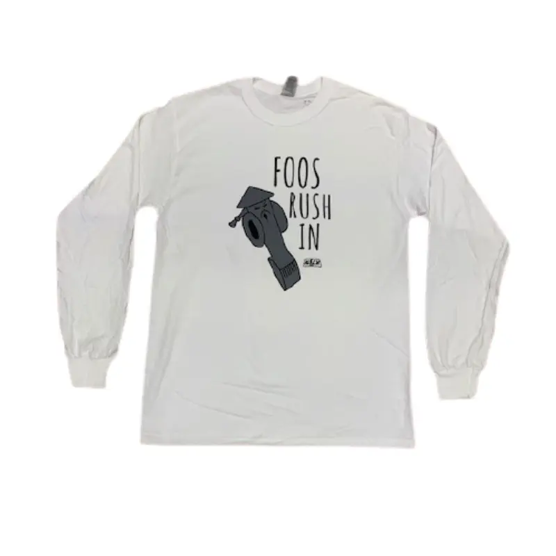 Long Sleeve Long Sleeve 100% Cotton white T-Shirt with rib cuff and neck band and “Foos Rush In” black and grey Graphic on Front.