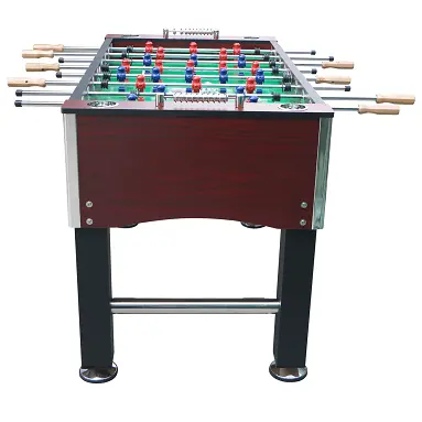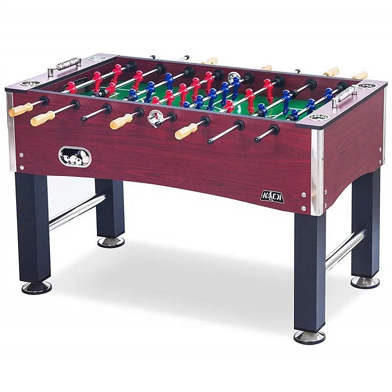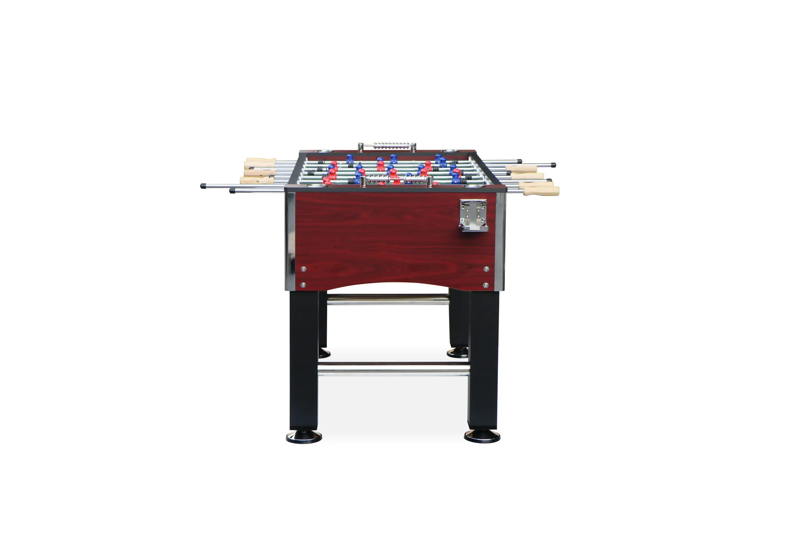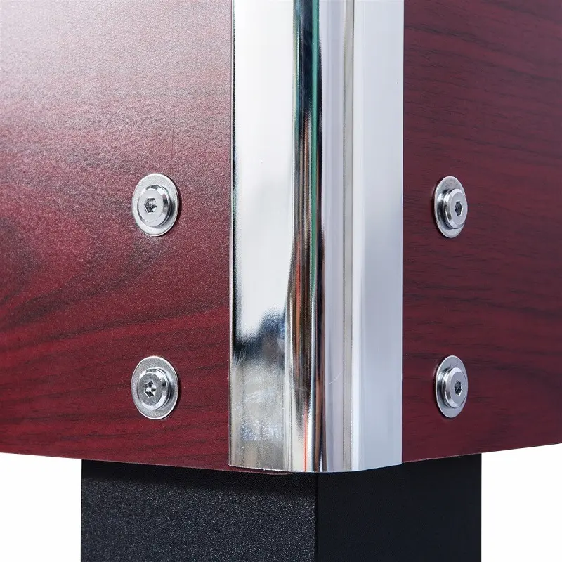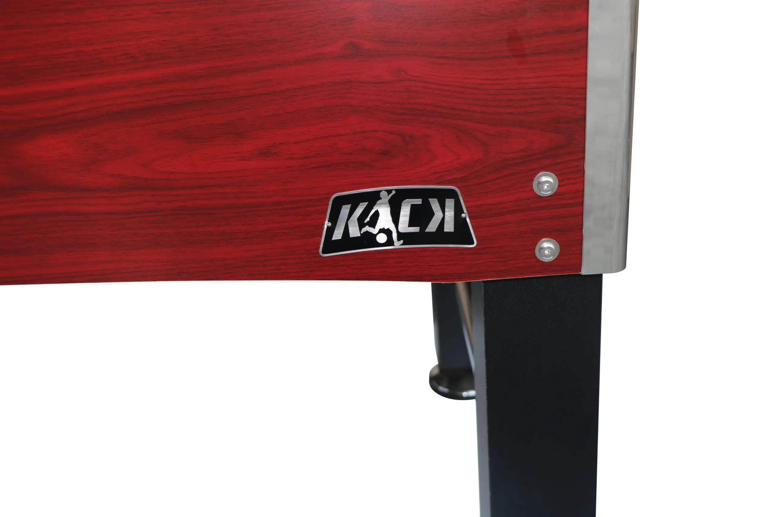 The KICK Royalton 55" Foosball Table, a perfect blend of quality and style. Featuring a warm reddish wooden cabinet, black square legs, and precise gameplay, this table fits beautifully in any home. Enjoy a straight and stable playing surface with levelers and extra bars.