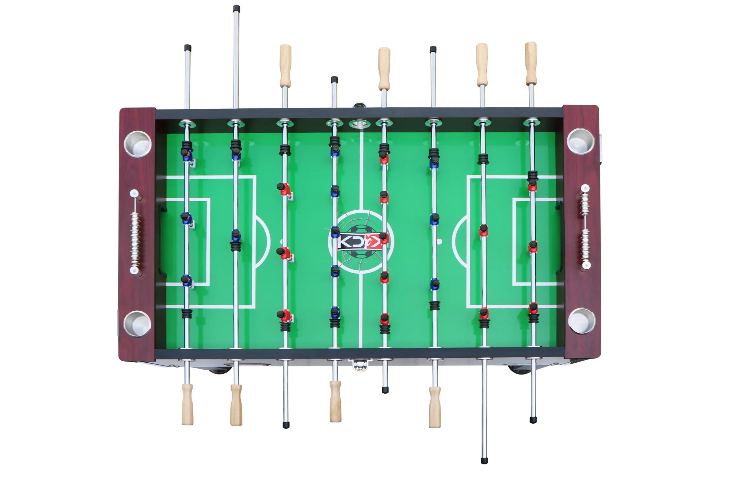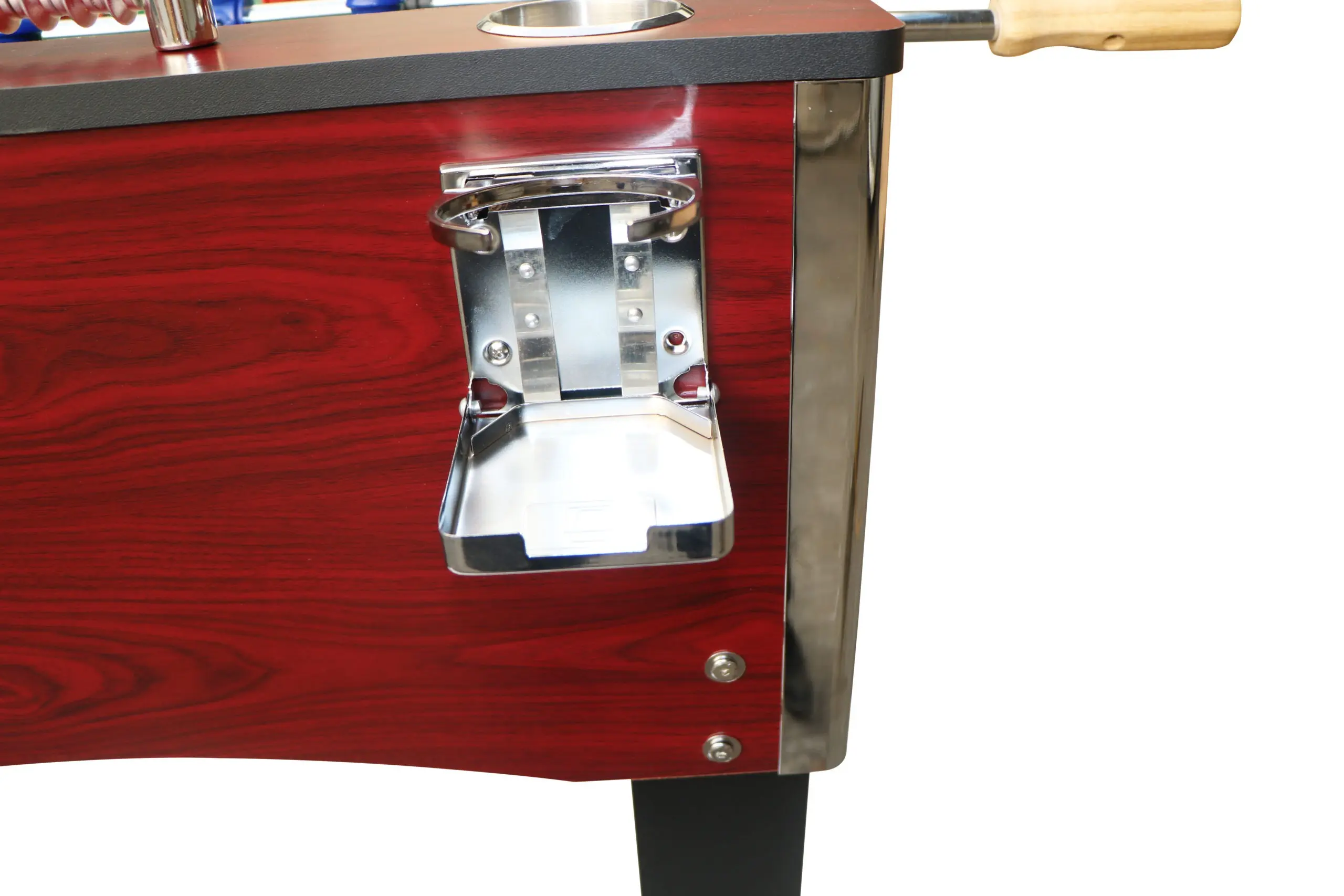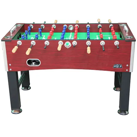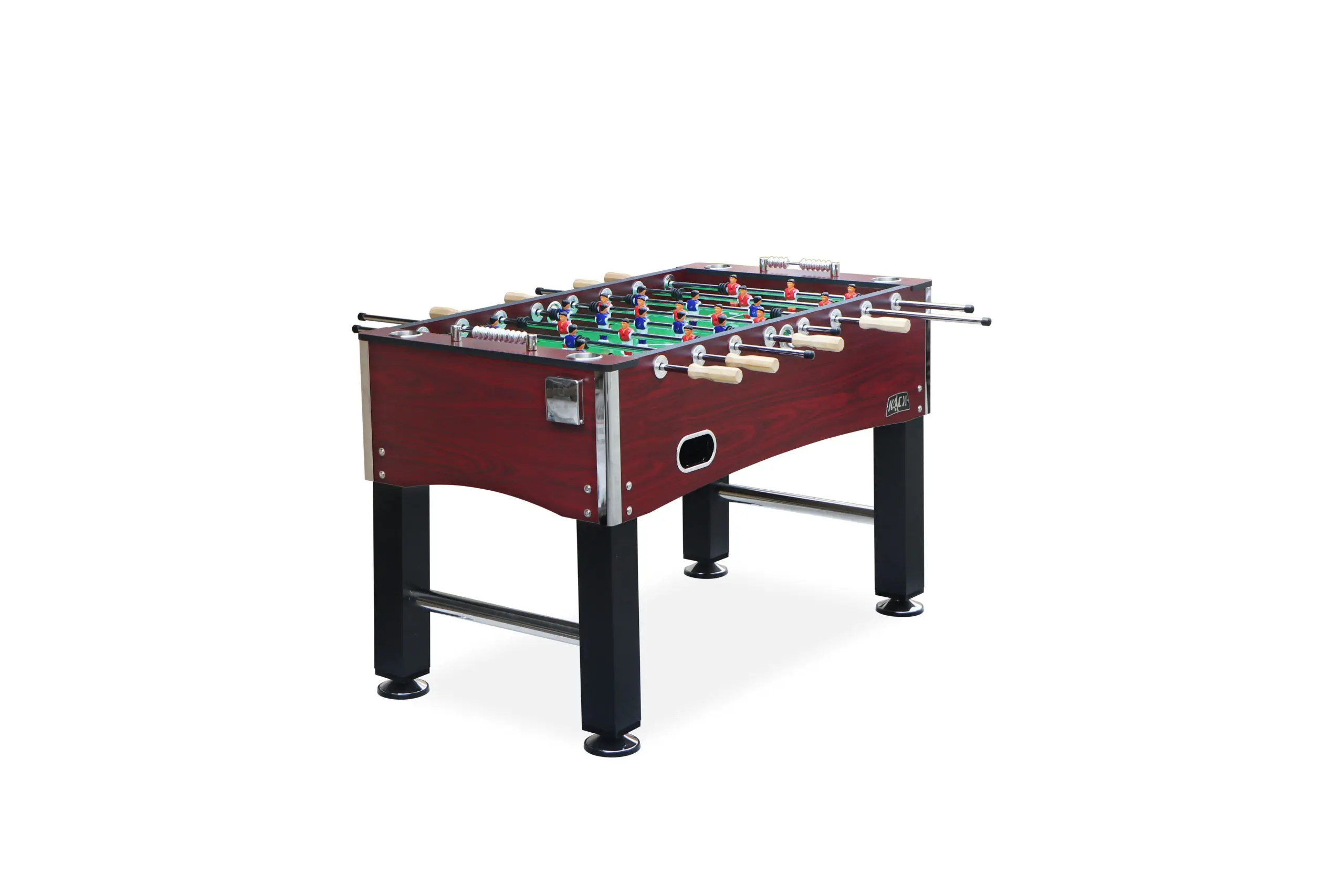 The KICK Royalton 55" Foosball Table, a perfect blend of quality and style. Featuring a warm reddish wooden cabinet, black square legs, and precise gameplay, this table fits beautifully in any home. Enjoy a straight and stable playing surface with levelers and extra bars.