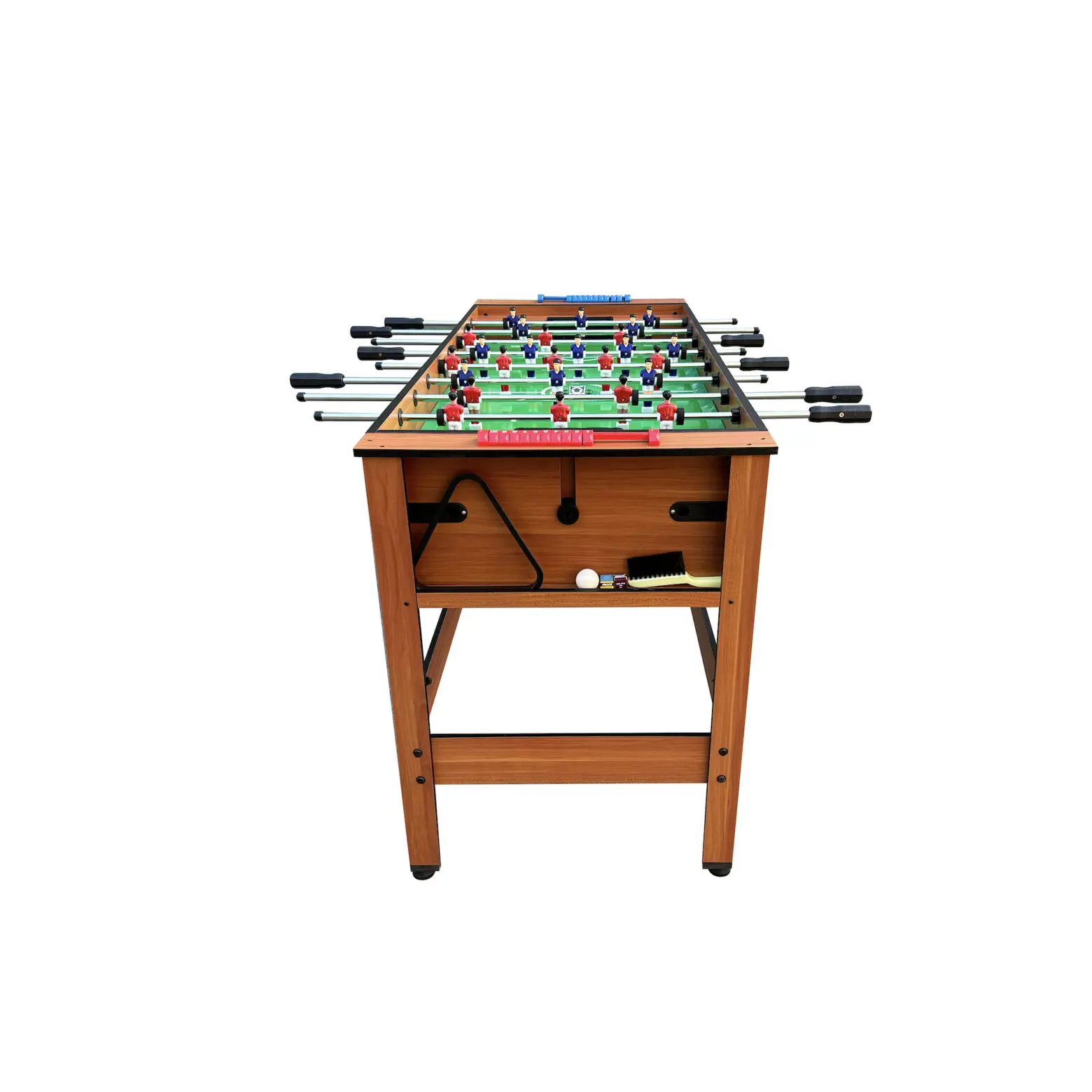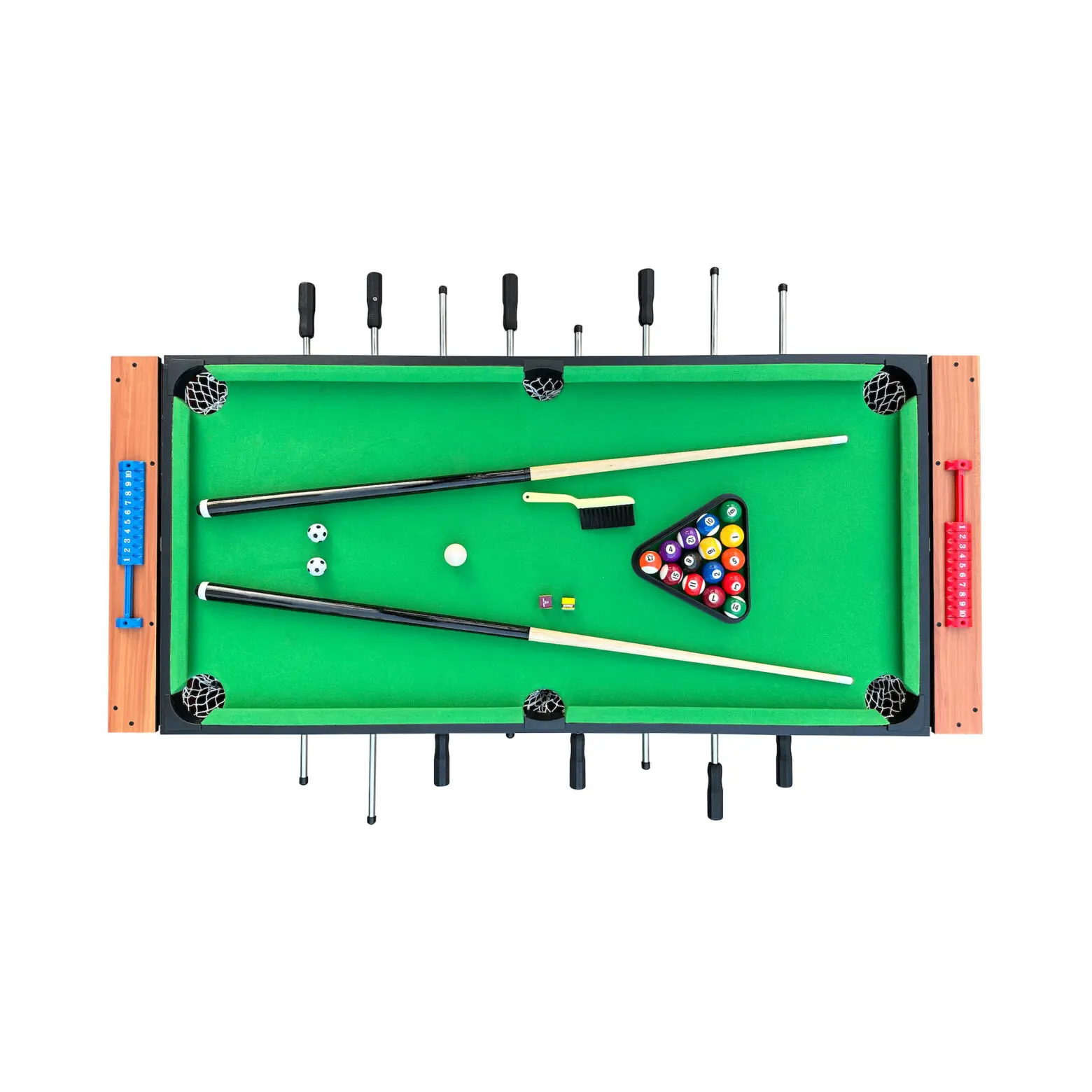 Discover the incredible craftsmanship of the KICK Twain 48" 2-in-1 Multi Game Table. A genuine masterpiece of multi-game innovation, designed to elevate your game room with exceptional excellence. Enjoy exciting billiards/pool or foosball sessions with your loved ones, all conveniently built into this single table to save space. The square leg design and 42-mm plastic leg levelers ensure a strong structure and a perfectly even playing surface. With its durable construction, this game table ensures hours of captivating play, with each match delivering an extraordinary gaming experience. Moreover, its thoughtful design caters to players of all ages, making it a versatile addition suitable for both kids and adults.
