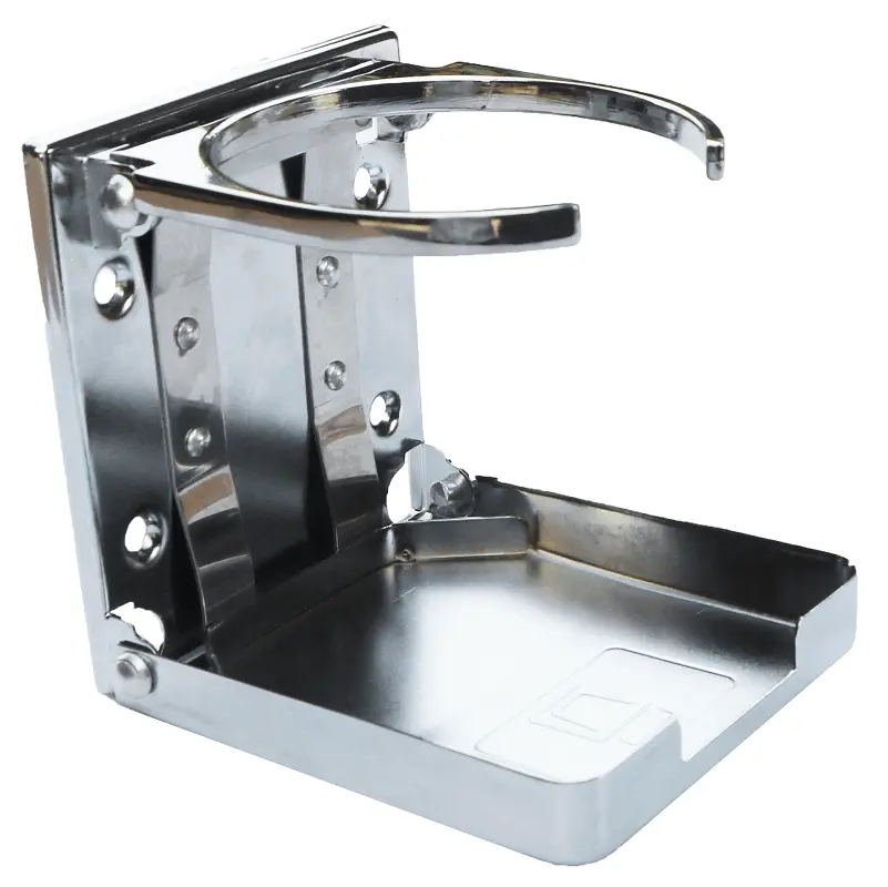 This is our standard cup holder that comes with some table models and has the Kick logo on it. It is made of hard plastic in a silver color. It can be folded out of the way when not in use.
